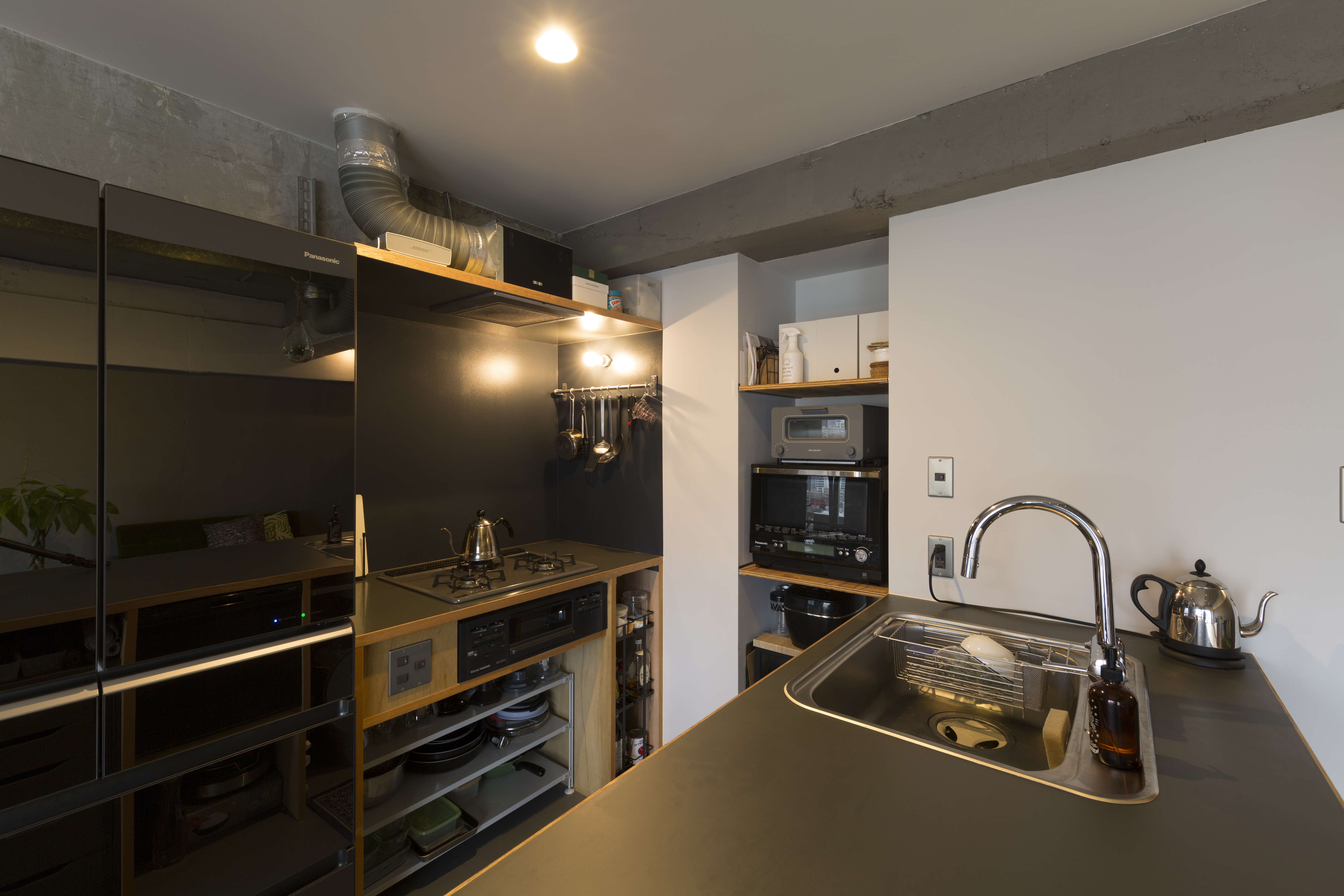 調理動線や使い勝手を設計者と話し合って制作したキッチン。グレーの天板が空間の引き締め役。