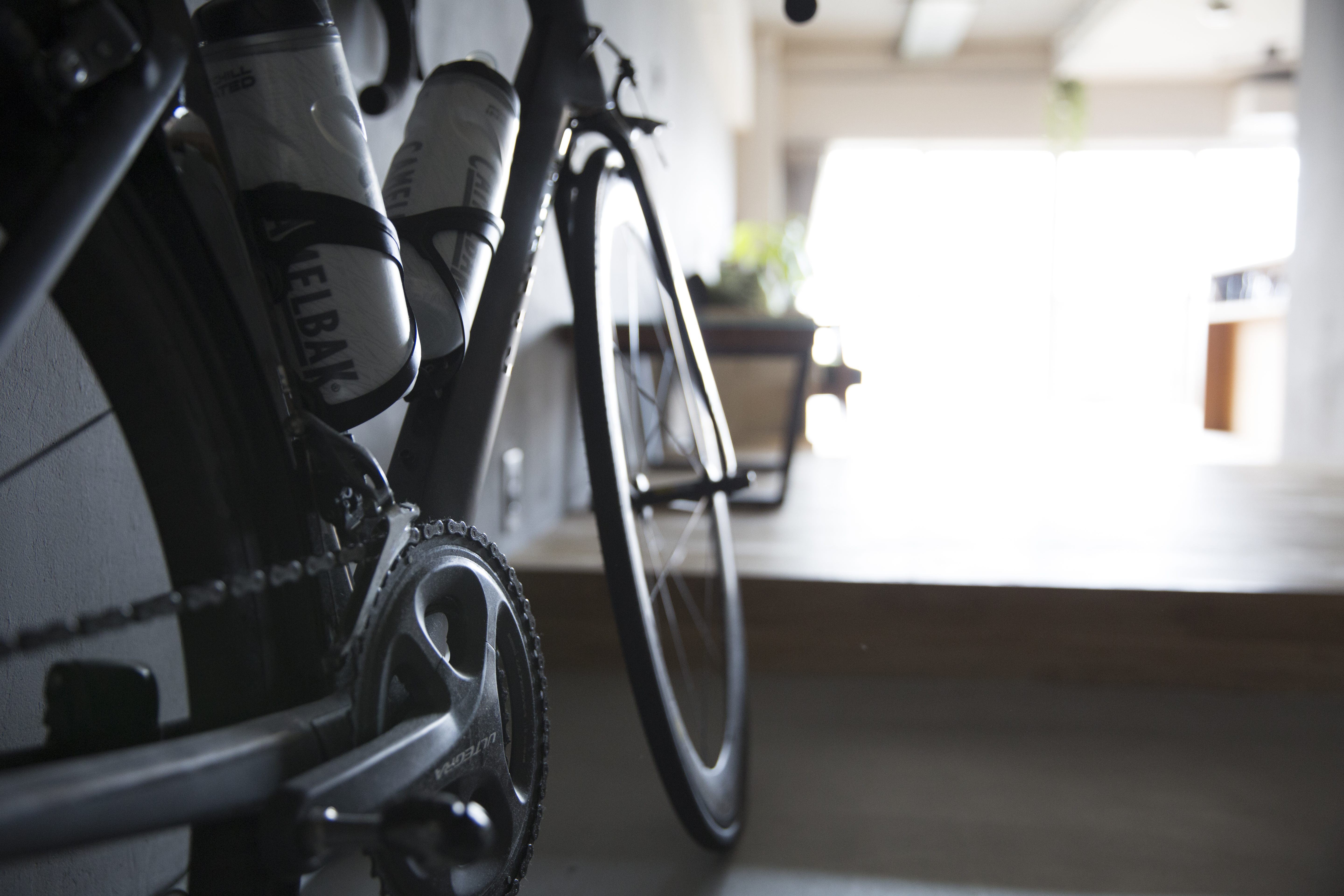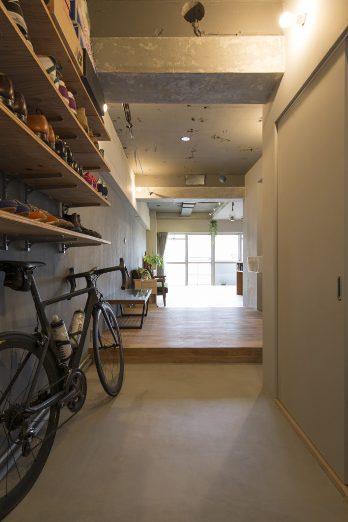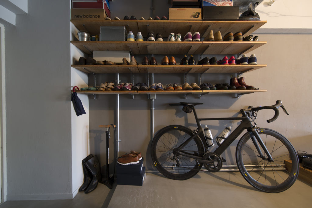 ロードバイクや靴をメンテナンスしやすいよう、玄関まわりはゆとりのある空間に。