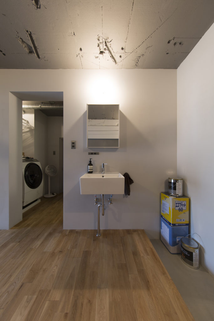 ど真ん中に洗面スペースがある大胆な間取り。実は暮らしやすい動線になっているとは、Yさんの弁。