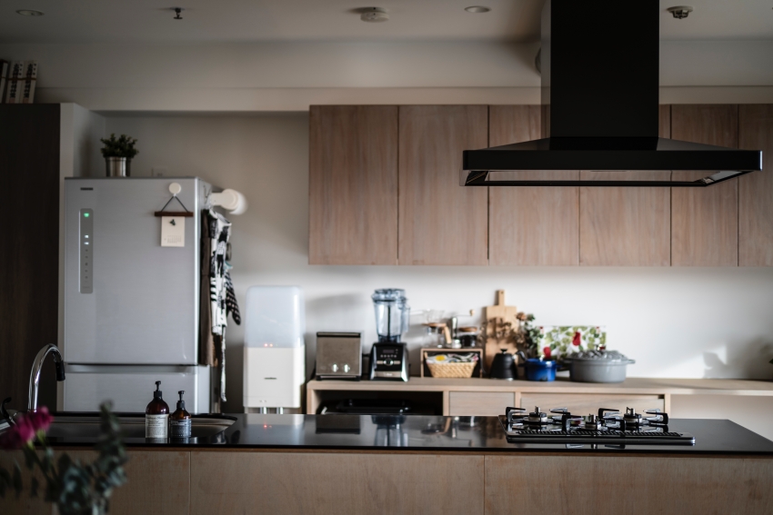 「キッチン天板の厚みは、通常30〜40ミリくらいにするのですが、今回はブラックなので重く見えてしまう可能性がありました。ご主人が求めていた”かっこよさ”から離れてしまいそうだったので、天板の厚みを12ミリにしました。さらに天板とキャビネットの間にライン状の細い凹みになるように段をつけて、陰影によるメリハリが出るようにしました。その結果、シャープな印象になったと思います」(山口/スマサガ設計チーム)