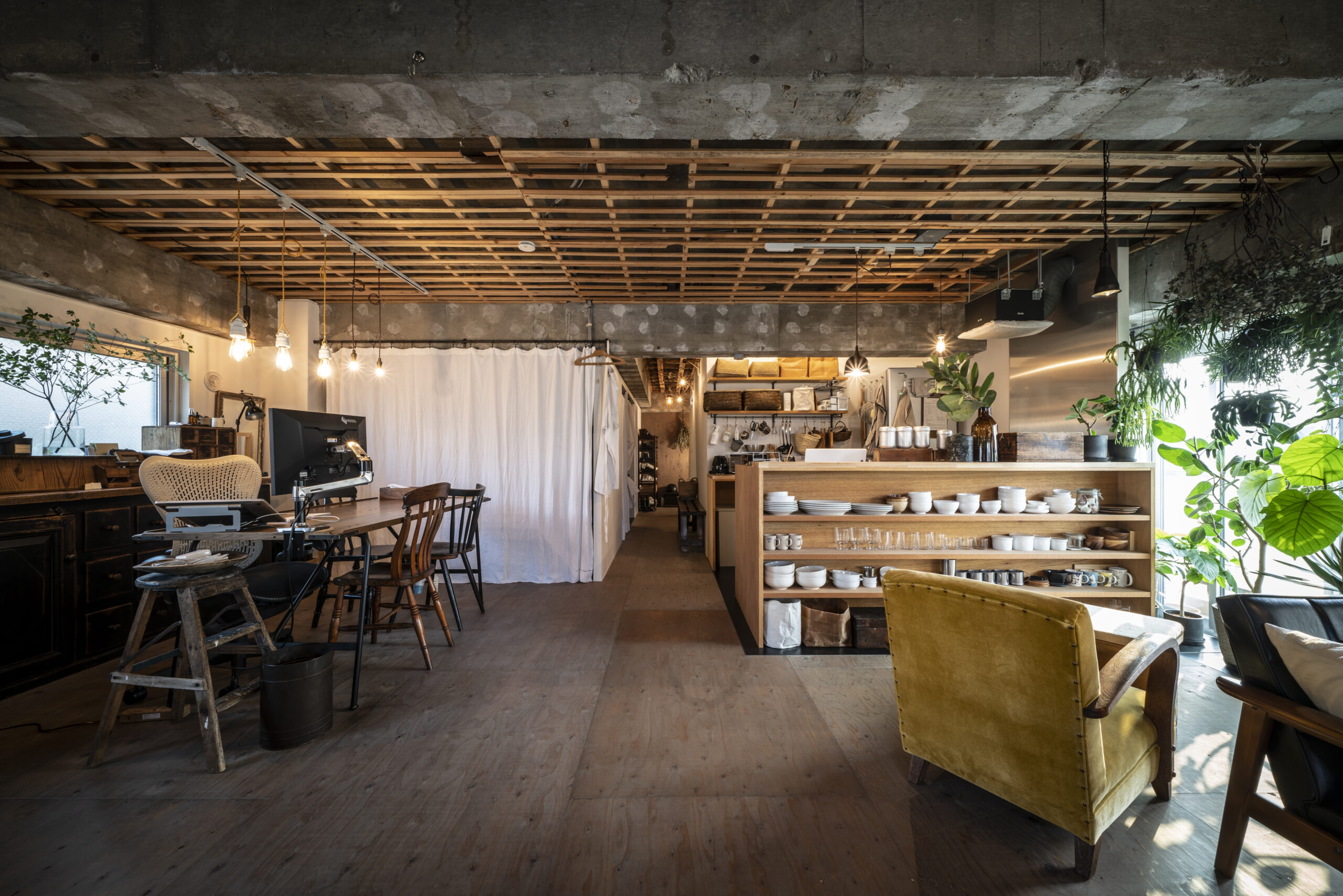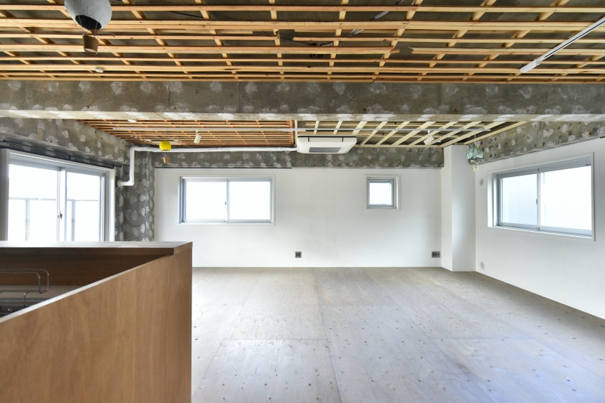 「とにかく、無くても問題なさそうなものは全部取って、天井や壁も無くして倉庫のような『箱』にしたいなと。私たちが結婚する前から、家はほぼ倉庫みたいな感じがいいよね、という意見が一致してたんです。引いて引いて引き算して、残った最低限のものでスタートして。そこから後は自分たちで好きなように作っていけばいいと思っていました」(Hさん)