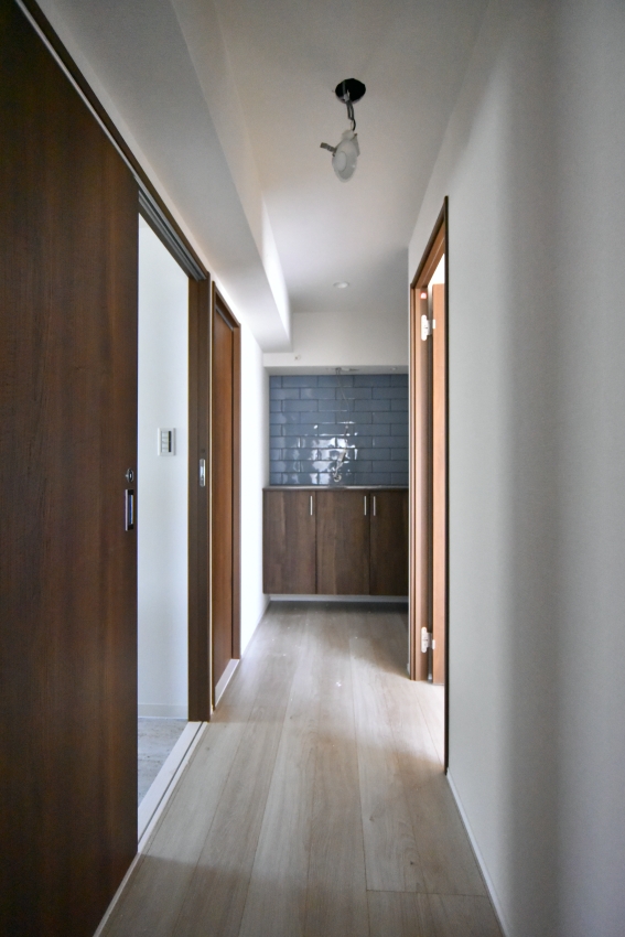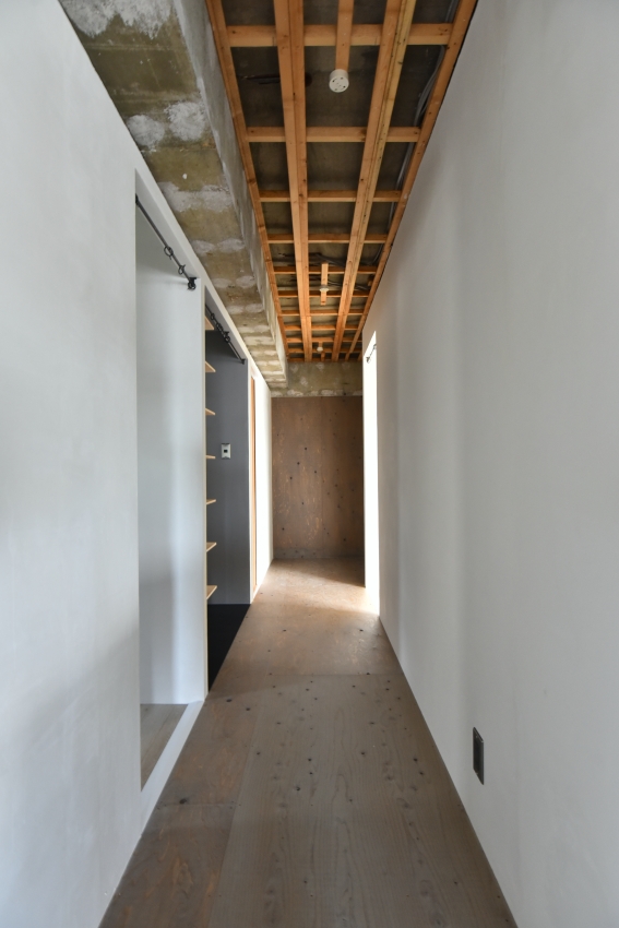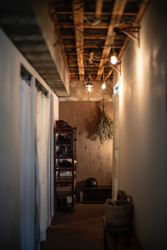 「玄関にはもともと備え付けの下駄箱があって、壁にタイルも張ってあったのですが、それも全部剥がしちゃおうと。とにかく取れるものは全部取って、天井も取りました。ドアは新しく変えたかったんですけど、予算的に厳しそうならドアも無くしてしまおうということになって、扉関係は結局全部なくしました」(Hさん)