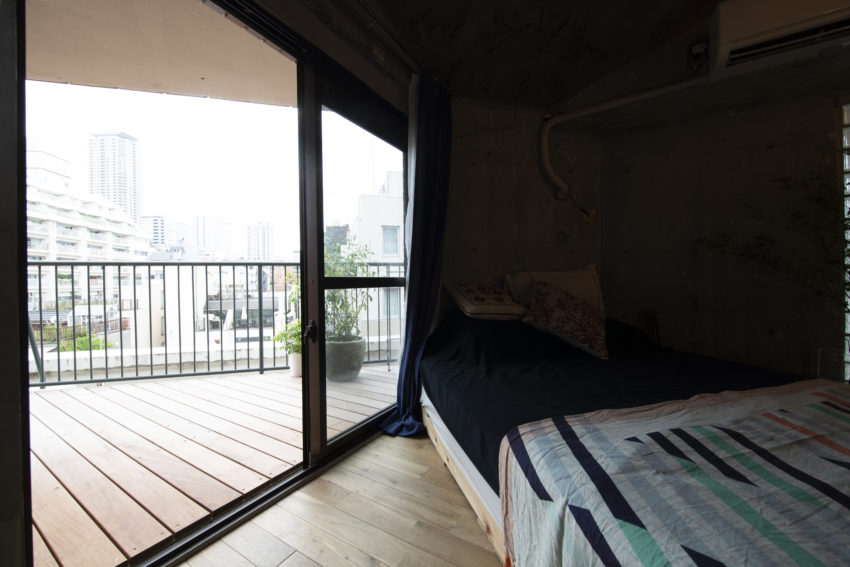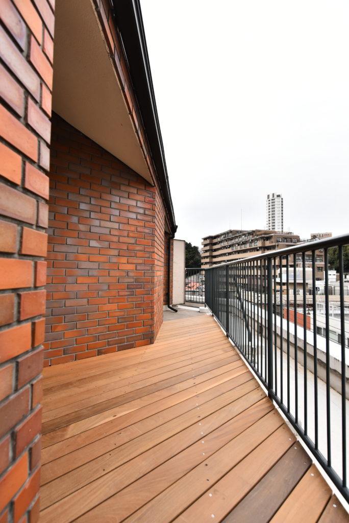 室内とバルコニーの床の高さを合わせることで、内外の空間を感覚的につないだ。室内はオーク材の無垢フローリング、バルコニーはイペ材のウッドデッキを採用。