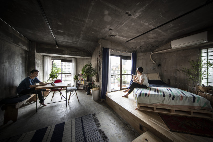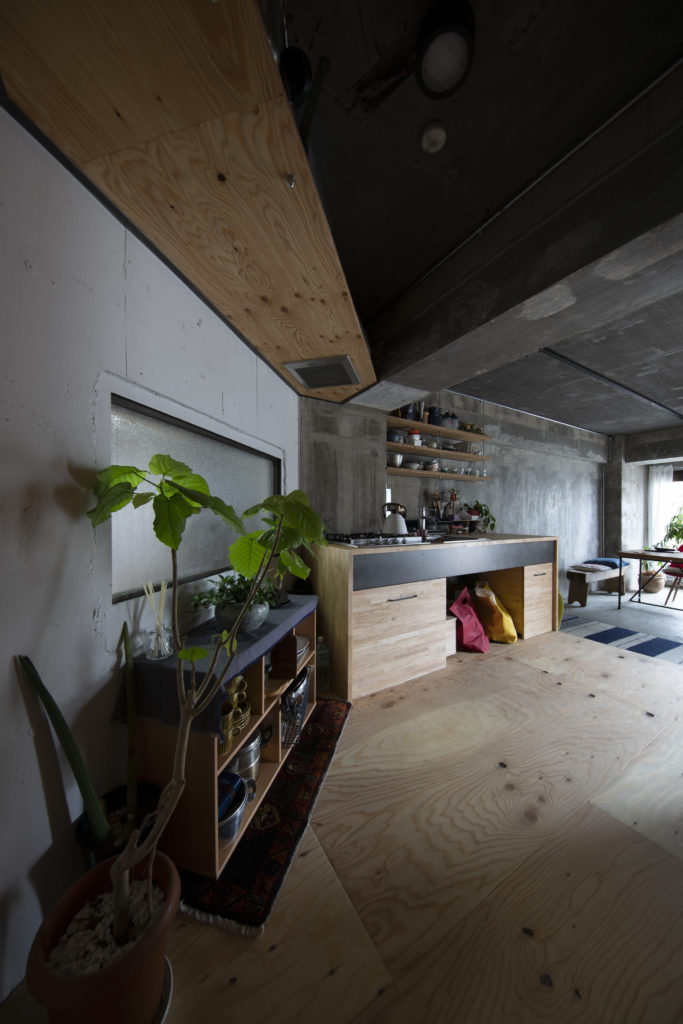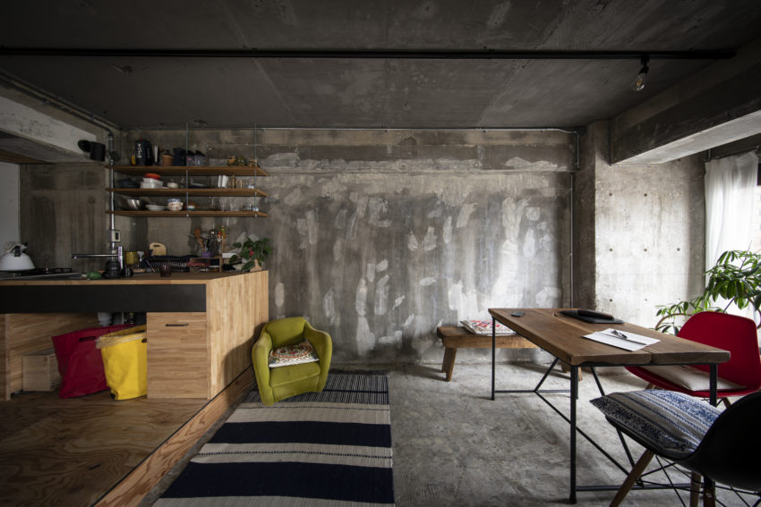 リビングは壁も床も元の内装を解体してコンクリートの躯体現しに。躯体に白い断熱材が貼ってあった天井には粘土質の塗料を塗って周囲の色調にトーンを合わせた。