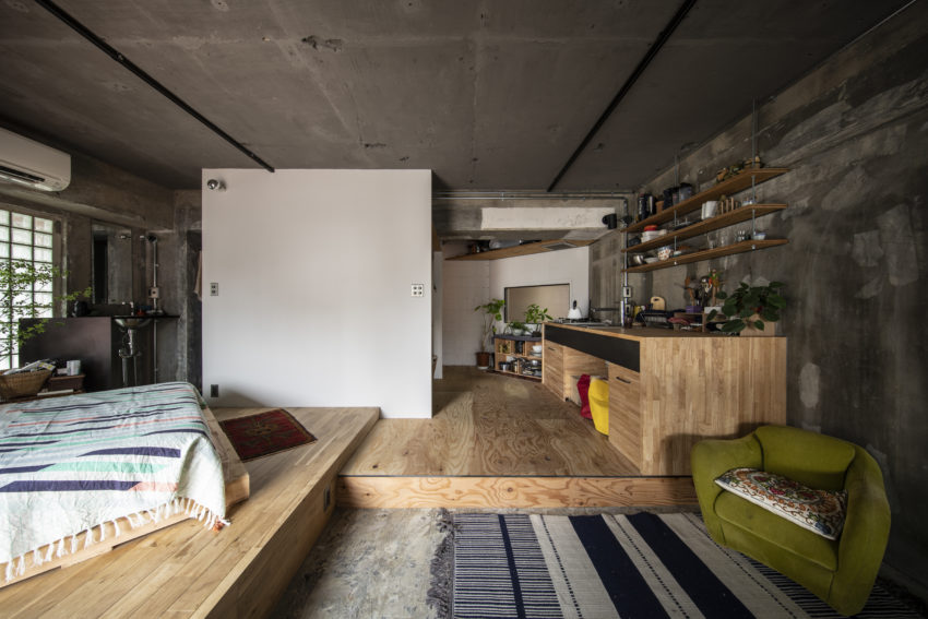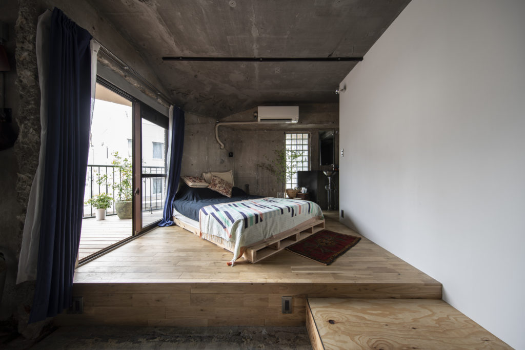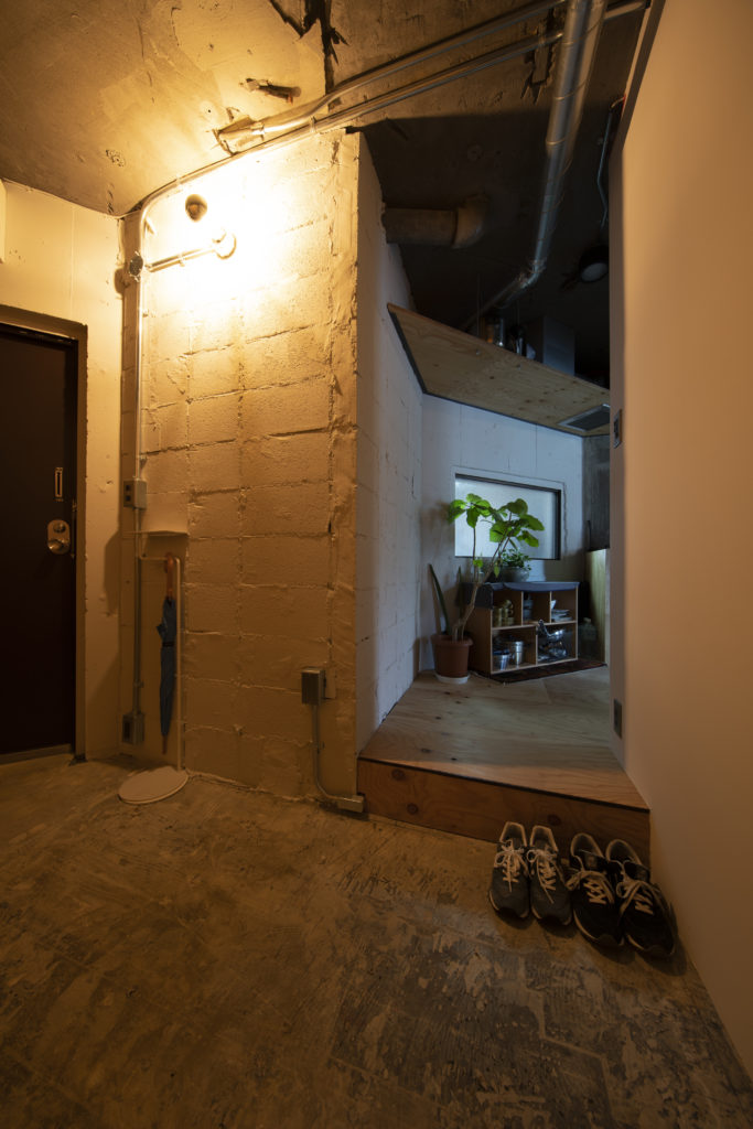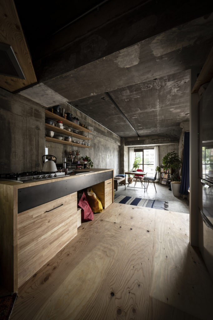 そこで、大枠の間取りをデザインするにあたって、すべての壁や床、天井を取り払ってスケルトンにした空間の真ん中に箱を置き、その周りを回遊できる動線を考えました。そして、間仕切りの代わりに床の段差を設定し、壁がなくてもいろいろな居場所が自然に生まれるような設計にしています。このコンセプトから始めていって、お二人の暮らしに必要な要素を詰めていきました。