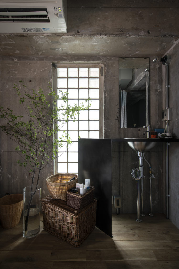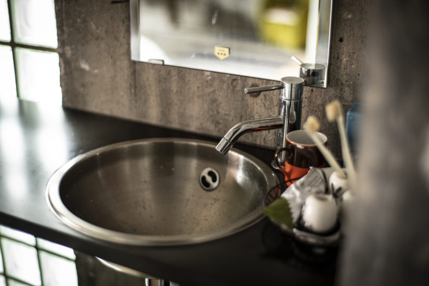 洗面台は鉄の板を折り曲げて造作したカウンターに、シンプルな洗面ボウルを埋め込んで制作。周りの空間に調和するよう慎重に寸法を検討した。