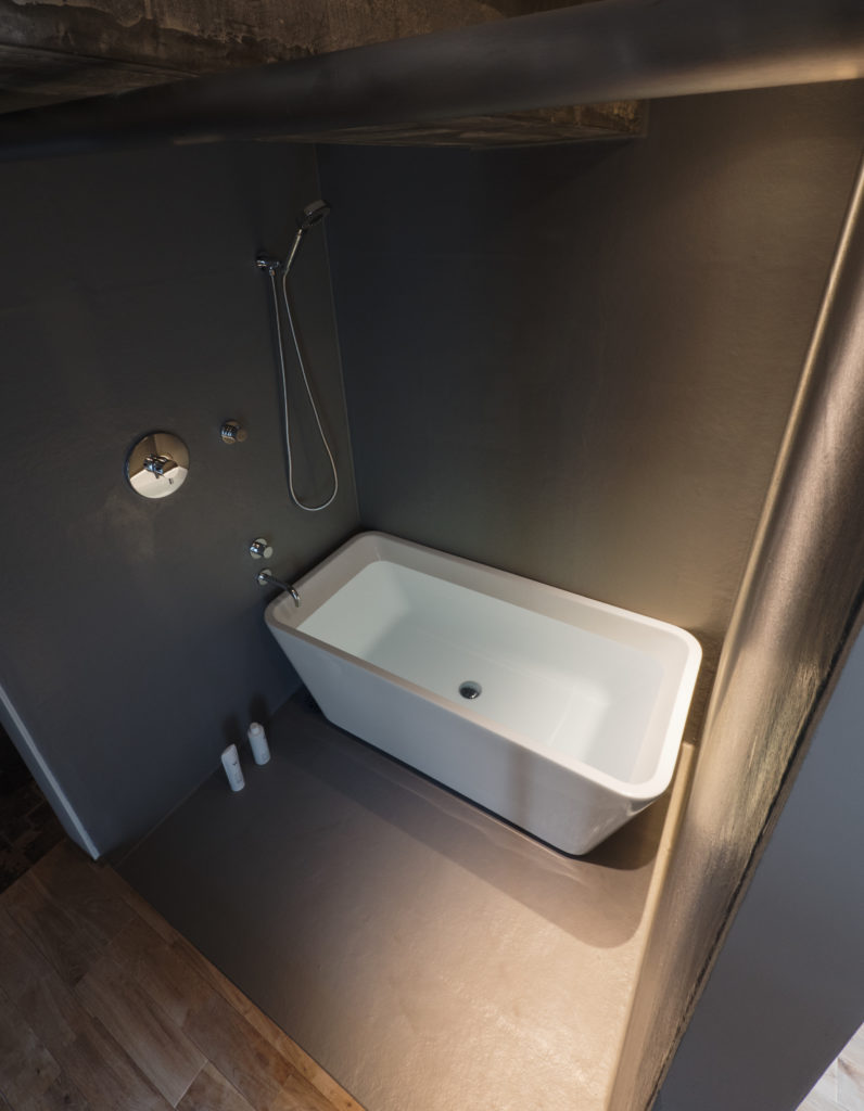 浴室の壁と床はFRPで防水層をつくってトップコートを塗装しただけのシンプルかつローコストな仕上げ。トップコートの色をグレーに調色したのがポイント。