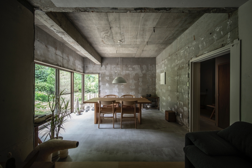 駆体現しの壁と、角が抜けた窓の先にグリーンが広がるK邸の印象的な光景。