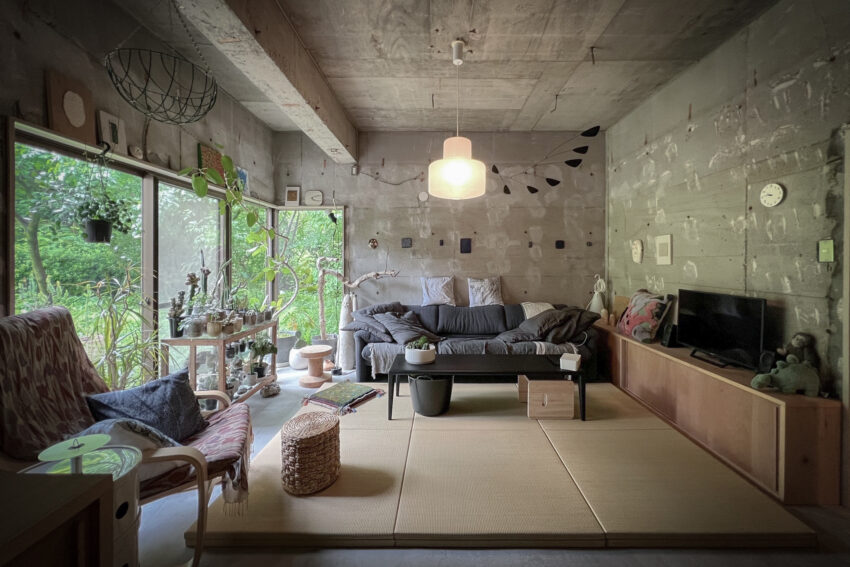 リビングのモルタル床に重ねて敷いていた琉球畳は、実は親戚からのもらいもの。置いて見たら意外といい感じだったから、と話すお二人は、その時々に合わせて柔軟に空間を作っていきます。自分たちの好みやこだわりが明確で、お互いに共有できているからこそでしょうか。