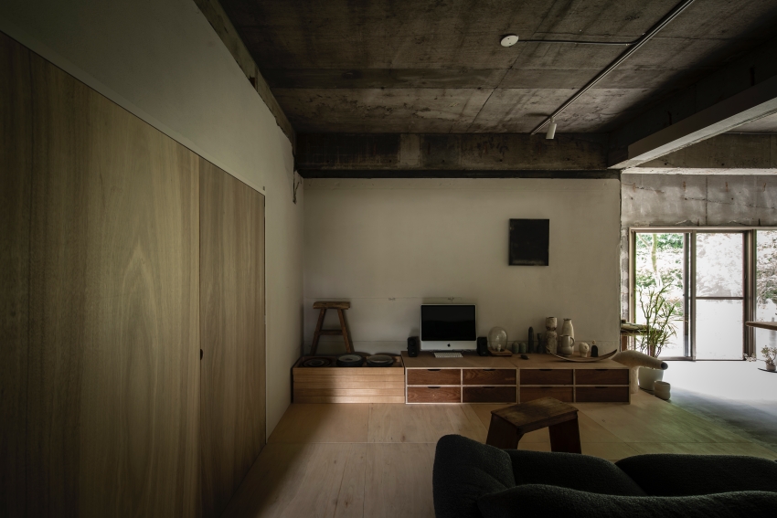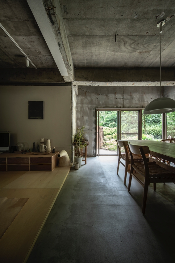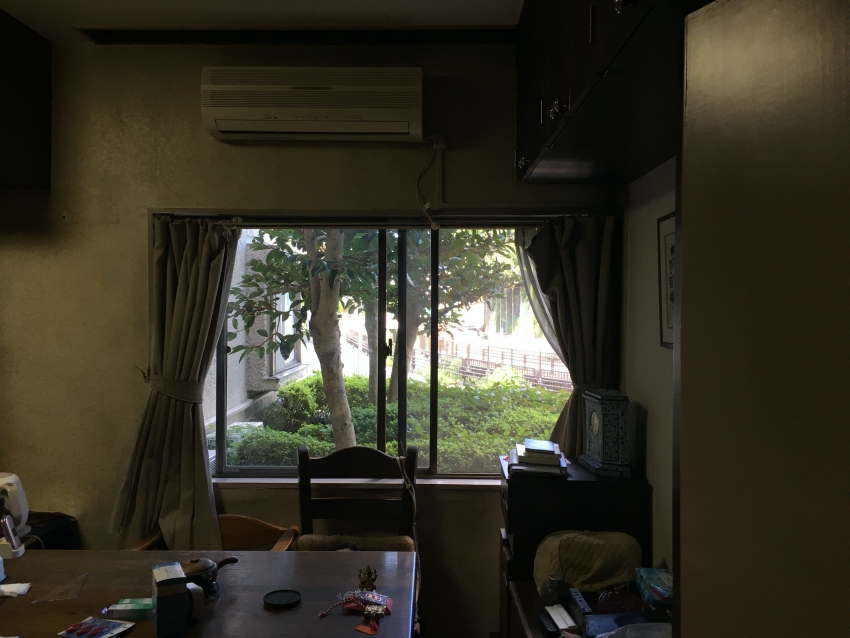 住居と陶芸のアトリエスペースを兼ねて、リノベーションができる広めの物件を探していたKさんご夫婦。当初はピンとくる物件が見つからなかったものの、駅から離れれば見つかるかもしれないと条件を広げて出会ったのが、緑の中に佇むマンションでした。内見時は売主さんがまだ居住中で、部屋の広さや外観、庭の様子くらいしかわからなかったのですが、その日に購入を即決しました。