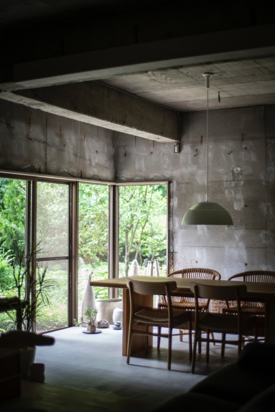 駆体現しの壁と、角が抜けた窓の先にグリーンが広がるK邸の印象的な光景。