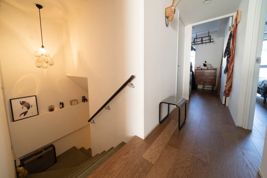 物件探しで、今の家にピンときたポイントは、「空間の抜け感と素敵な内階段」。「この階段がめちゃくちゃポイント高くて。なぜかというと、それまで少しでも気になる照明を見つけたら買っていたので、飾れないアイテムをいっぱい持っていたんですよね。この階段にその照明を飾ることが想像できました」(ヨウスケさん)