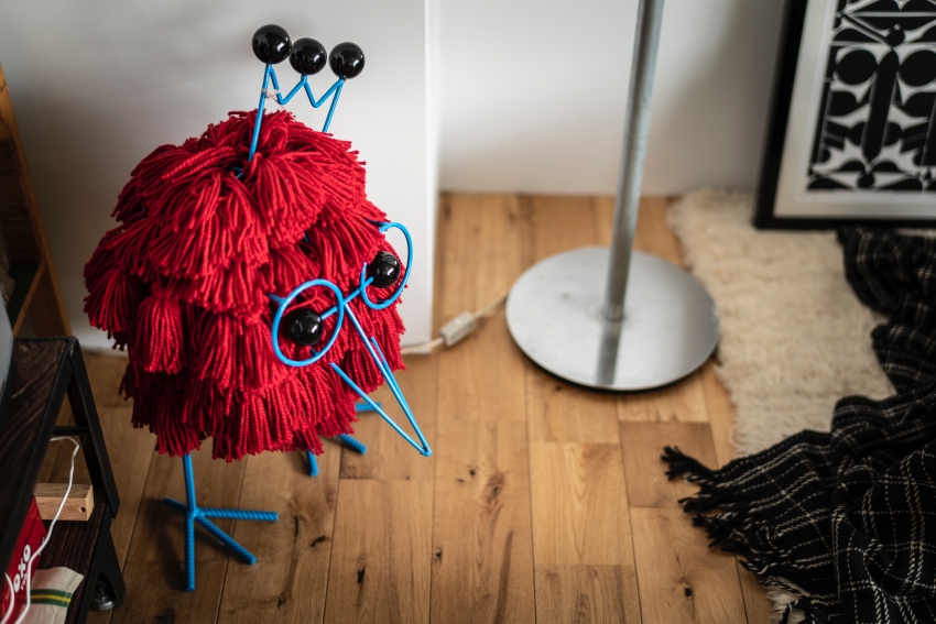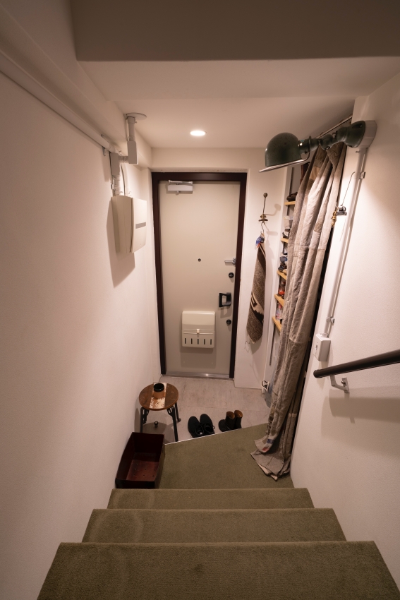 物件探しで、今の家にピンときたポイントは、「空間の抜け感と素敵な内階段」。「この階段がめちゃくちゃポイント高くて。なぜかというと、それまで少しでも気になる照明を見つけたら買っていたので、飾れないアイテムをいっぱい持っていたんですよね。この階段にその照明を飾ることが想像できました」(ヨウスケさん)