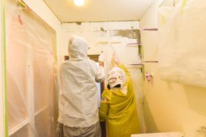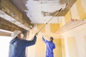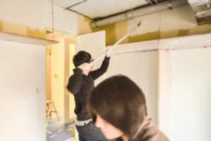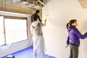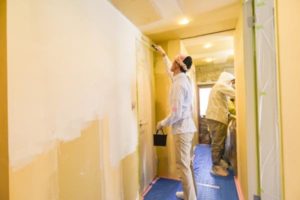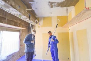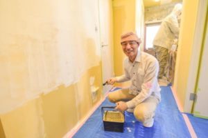 天井を塗るときは、帽子やタオルが必須。そうしないと、髪の毛が塗料まみれになります~