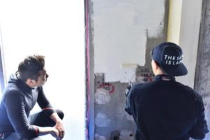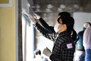 まずは恒例の自己紹介から これから塗る壁の前でパシャり。