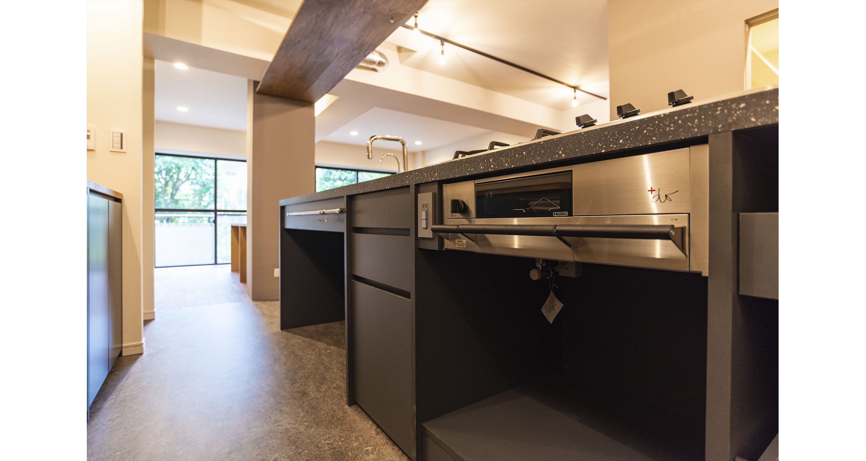 この部屋ならではの特徴で特に目を引いたのは、玄関入ってすぐのところにドア to ドアで寝室に入ることが出来る扉が設置されているところや、廊下にアクセントをもたらす洗面台の設置。そしてシステムキッチンではなくオーダーキッチンが設置されているところです。
