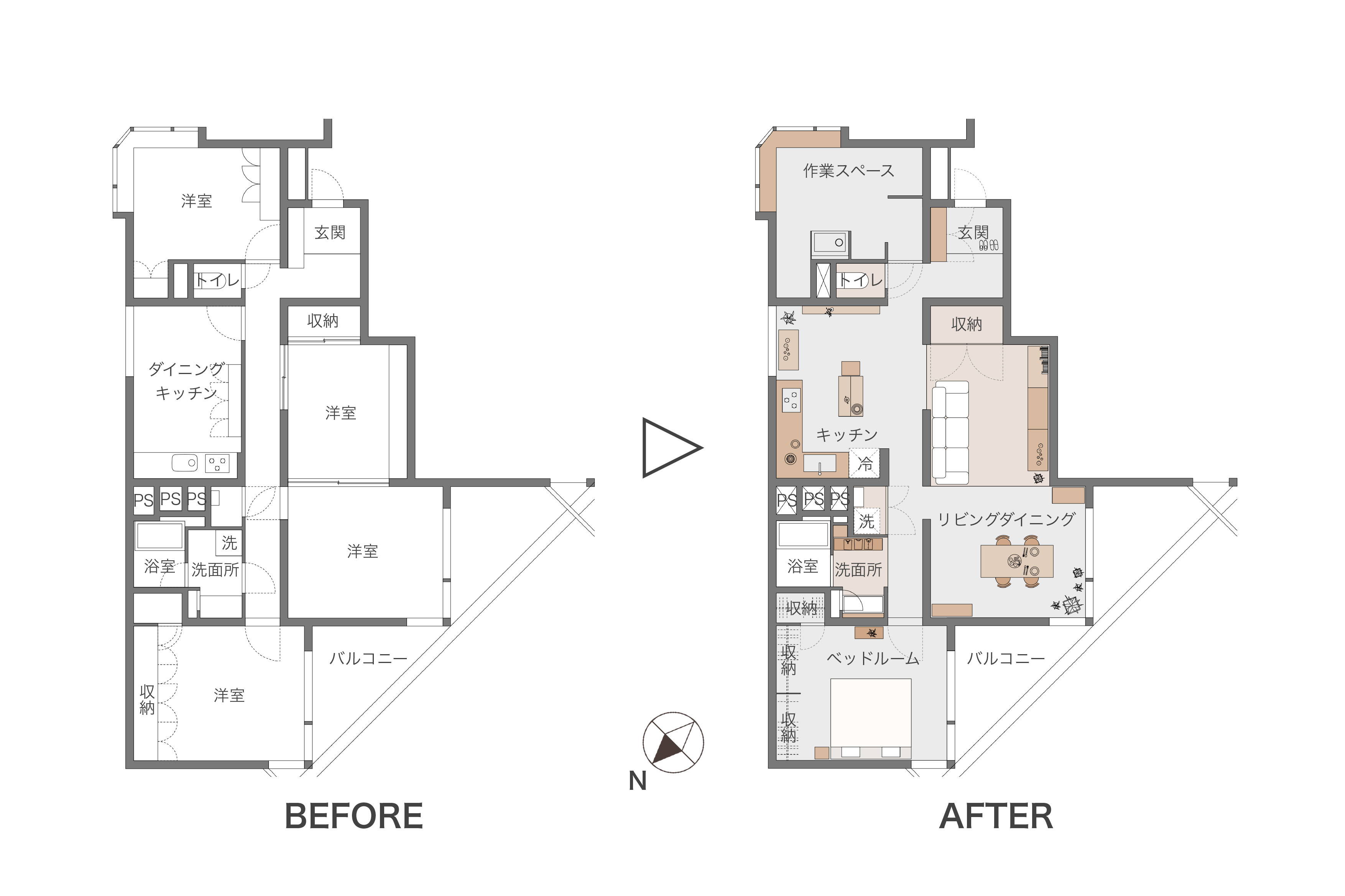 今回は、リノベーションが完成するまでのプロセスや、暮らしてからの変化を写真でご紹介いたします。リノベーションにより「自分らしい住まい」が完成!というわけではなく、そこにどのように家具を配置して、どのように暮らしていくか、自分自身で考えていくことが大切なことがきっと感じられると思います。