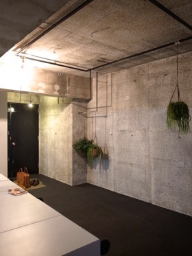 欧米的なリノベーションデザインとは少し違う、TOKYO的なLOFT文化の表現として、墨色のモルタルでつくった通り土間に島が浮かんでいるような和的な空間構成、和紙を貼ったように壁が透過して見えるマスキング塗装などを取り入れています。