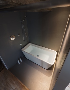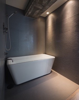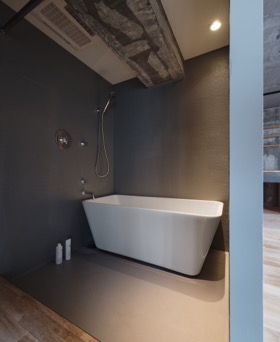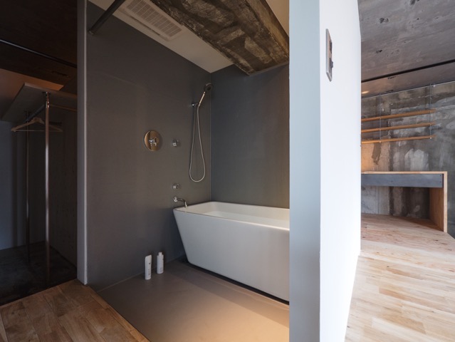 ここY邸の設計については、全体の空間としても素のままの素材を見せることを貫いているのですが、バスルームはより研ぎ澄まされたレベルでシンプルにしています。寝室から直接つながった場所にある造作された箱の中に防水を施し、そのFRP防水のトップコート(防水保護用の塗装)にグレー色を採用してそれをそのまま仕上げとしています。