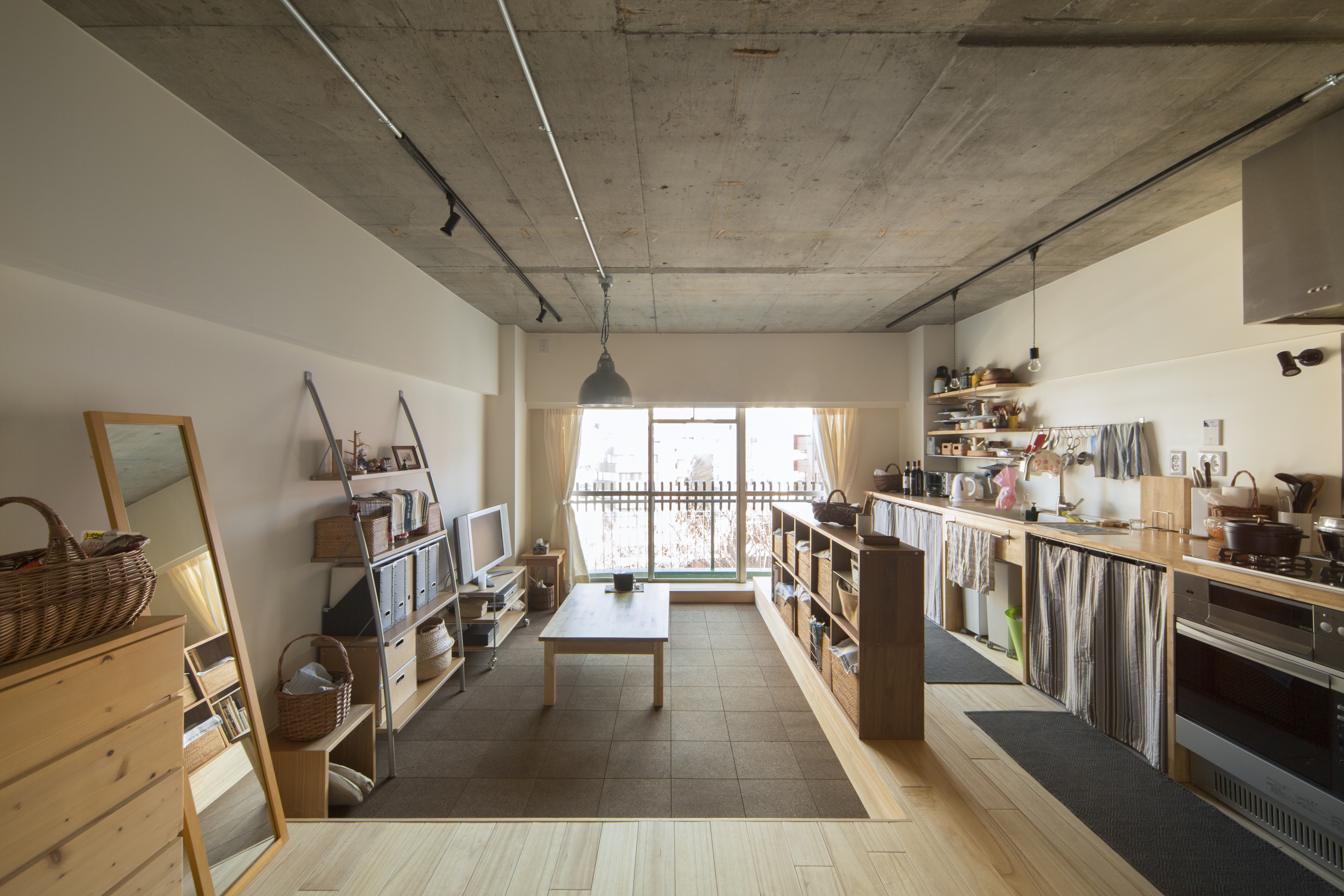 そこで、2LDKだった間取りを取り払い、開放感あるワンルームにすることで、どこからでも季節を感じられる住まいに。49平米/長方形のコンパクトな物件のため、キッチンエリア、ベッドエリア、リビングエリアがかなり密接した間取りですが、エリアごとに床高を変えることで、どこにいても心地よい空間になっています。