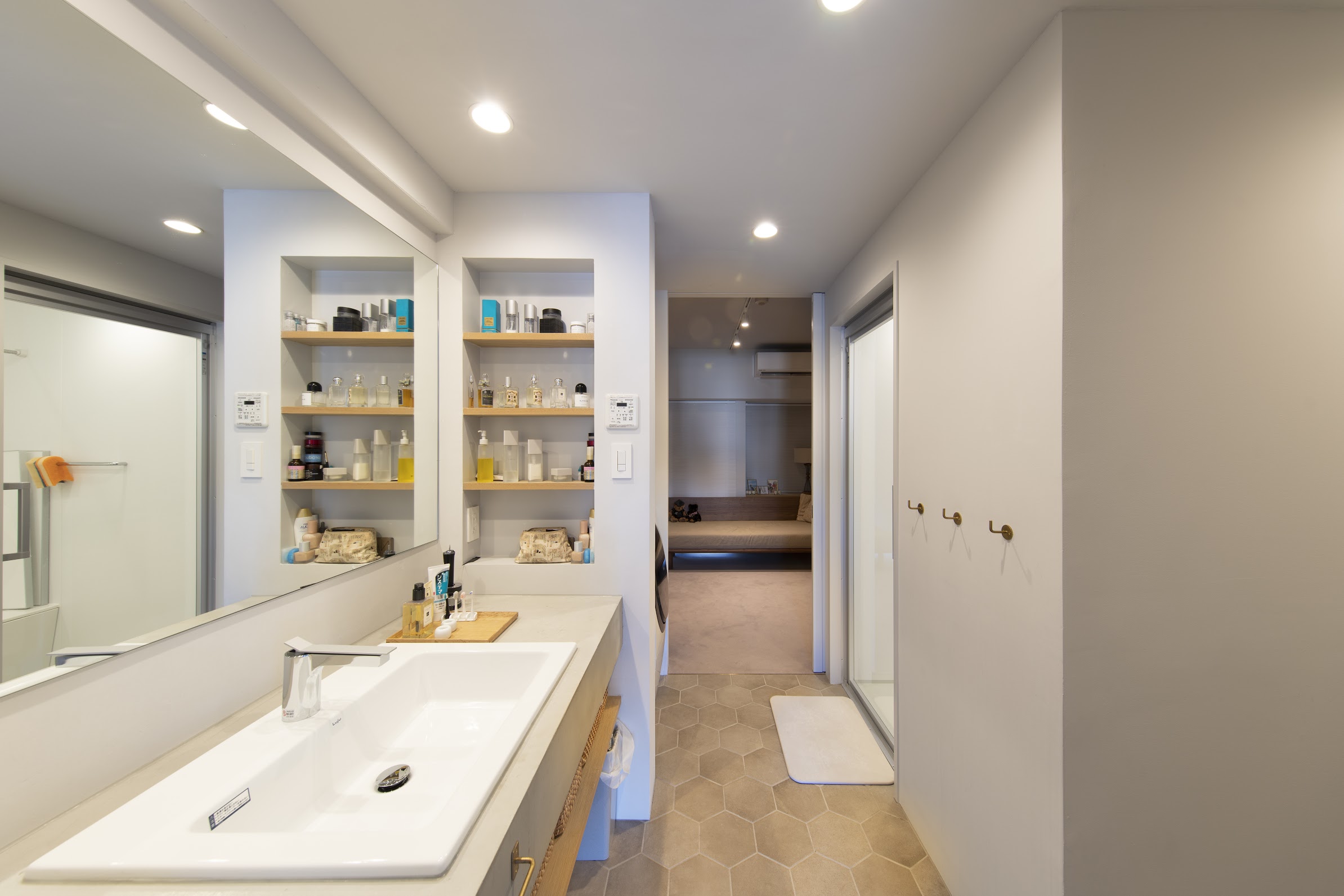 LDKと寝室の床には、ナラの無垢材を使用しています。そのため、湿度が高いこの時期でもペタペタしにくく、足ざわりがとてもいいです。洗面所の床にはタイルを敷いたり、オーダー制作した洗面カウンターにはモルタルを用いたり、様々な素材を取り入れて、遊びのあるお部屋にリノベしました。