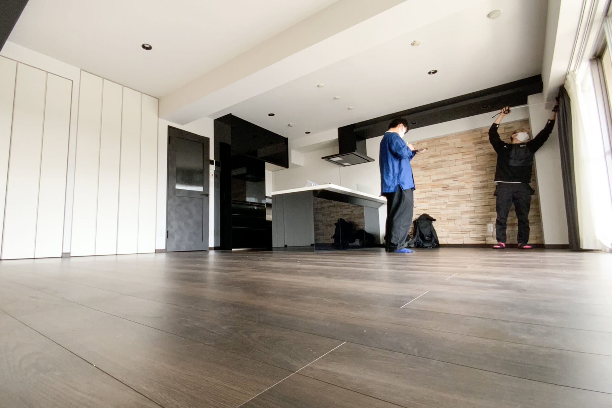※写真は、現調風景です。デザイナー山口と岸が、部屋の採寸や部屋の状況を確認しています。