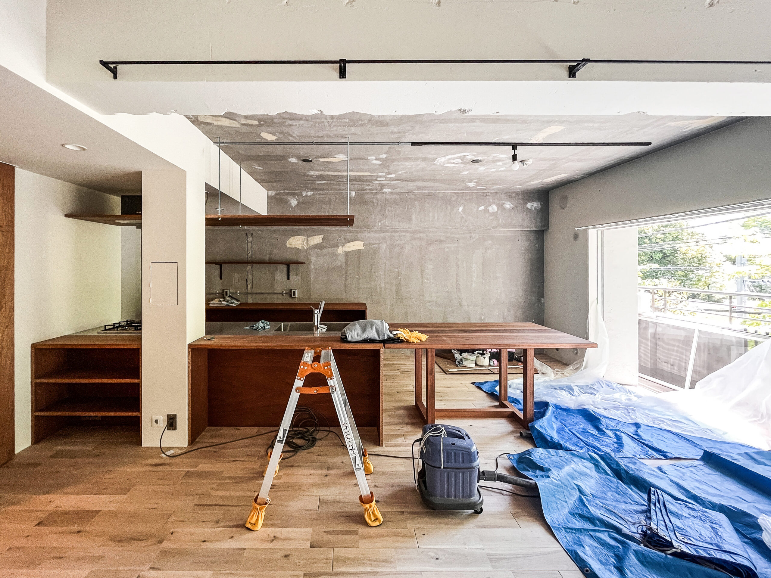 前回の【工事現場編】では、まだ設備の配管が剥き出しだったり、壁の下地が見える状態でしたが、一体どのような空間に変わったのか、、、完成したばかりのお部屋から、デザイナー岸と紹介いたします!