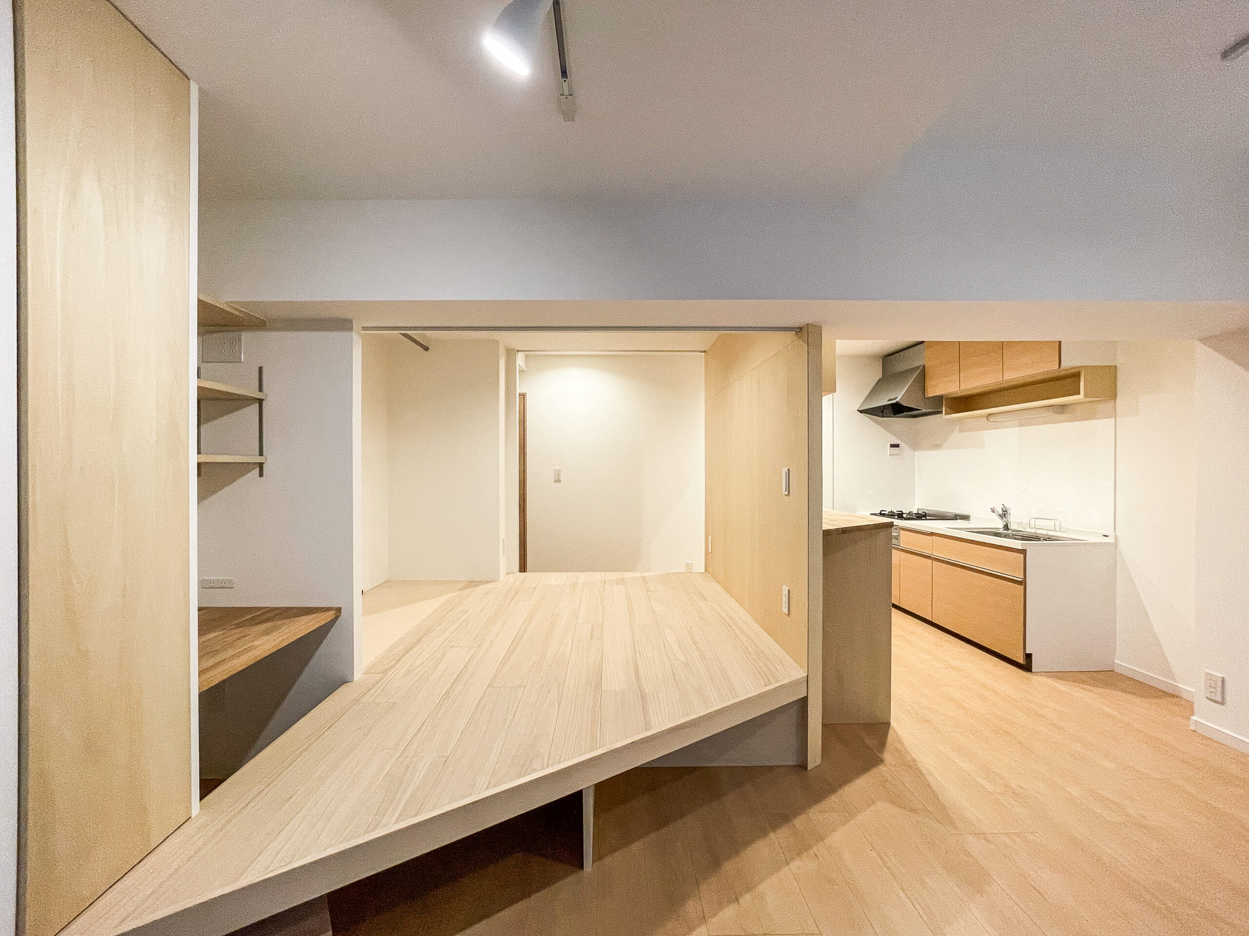 水まわり以外の間仕切りを取り払い、寝室・キッチン収納・クローゼットの機能をまとめた「箱」を部屋の中央に作りました。生活リズムが異なっていてもストレスがないようなゾーニングし、コンパクトな物件でありながらも様々なシチュエーションに対応したお部屋に生まれ変わりました♪